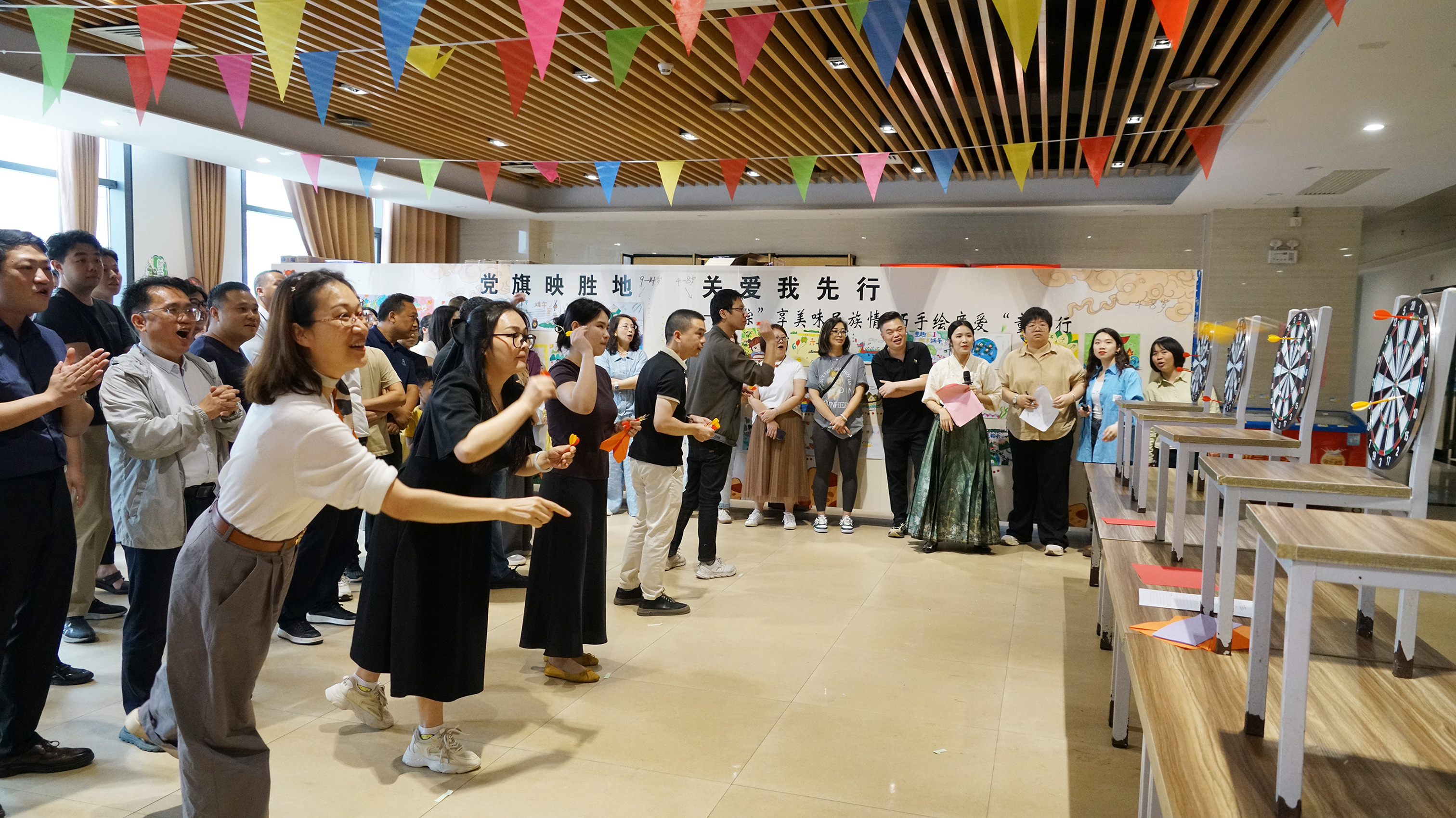 “家企同行·國風(fēng)非遺——民族文創(chuàng),與‘粽’不‘童’”趣味游戲挑戰(zhàn)環(huán)節(jié),將活動氛圍推向高潮。童年紙飛機(jī)、端午射五毒、趣味投壺三大趣味游戲讓職工與孩子都沉浸其中。在童年紙飛機(jī)游戲中,為了能讓紙飛機(jī)飛得更遠(yuǎn)、更久,大家興致勃勃地嘗試著各種折法,隨后用力一擲,紙飛機(jī)在空中劃出一道道優(yōu)美的弧線,有的飛得又高又遠(yuǎn),有的則在空中翻轉(zhuǎn)幾圈后穩(wěn)穩(wěn)落地,看著自己折的紙飛機(jī)歡呼雀躍,仿佛回到了無憂無慮的童年時(shí)光。端午射五毒游戲則充滿了傳統(tǒng)韻味,大家手持飛鏢,瞄準(zhǔn)靶心,每當(dāng)有人射中五毒圖案,周圍就會響起一陣歡呼聲,大家在歡聲笑語中感受著端午節(jié)的傳統(tǒng)習(xí)俗。趣味投壺游戲更是熱鬧非凡,參與者們瞄準(zhǔn)壺口,或站或蹲,調(diào)整著姿勢和力度,隨著一次次投中,現(xiàn)場的氣氛也一次次被點(diǎn)燃,歡呼聲、加油聲此起彼伏。歡聲笑語回蕩在整個活動現(xiàn)場。各組成員在比賽中相互配合、相互鼓勵,展現(xiàn)了團(tuán)隊(duì)合作的力量。最終,根據(jù)各組獲得的總分,評選出冠軍組,大家在歡樂中感受到了團(tuán)隊(duì)的溫暖與力量。