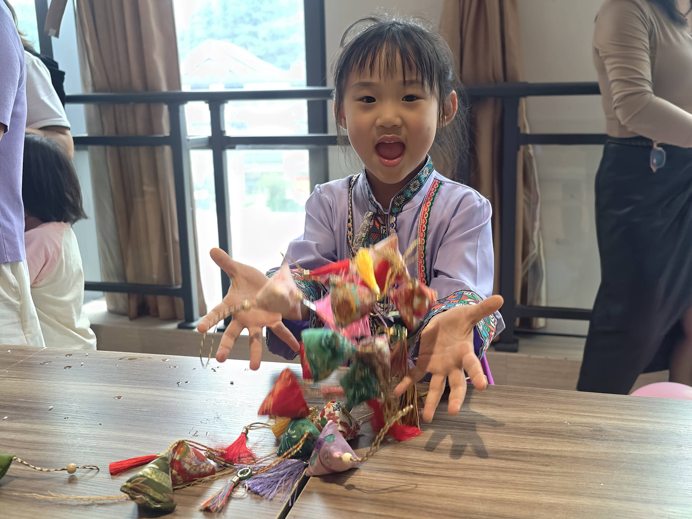 同時(shí),大家在歡快的氛圍中集體移步至“非遺香囊”區(qū)。在這里,冠軍組憑借出色的表現(xiàn)獲得了優(yōu)先挑選香囊的特權(quán),其余組別則按照游戲總分排名依次挑選心儀的香囊。大家通過端午節(jié)香包深入了解中國各民族在端午節(jié)制作、佩戴香囊的悠久歷史和豐富的非遺傳承文化,感受到傳統(tǒng)文化的獨(dú)特魅力?;顒蝇F(xiàn)場還準(zhǔn)備了豐富的下午茶糕點(diǎn)、粽子等美食,讓大家在享受文化體驗(yàn)的同時(shí),也能滿足味蕾的享受。