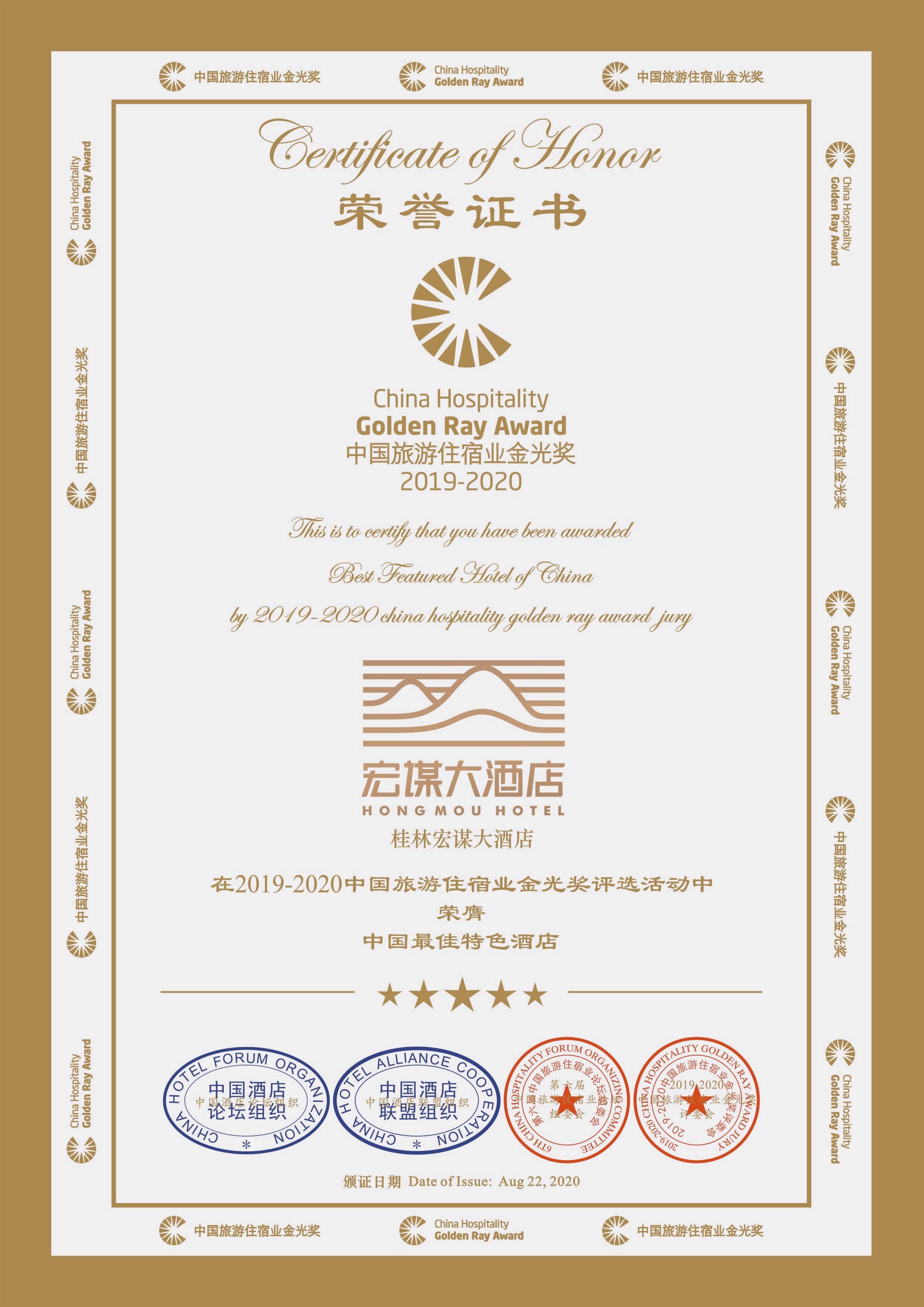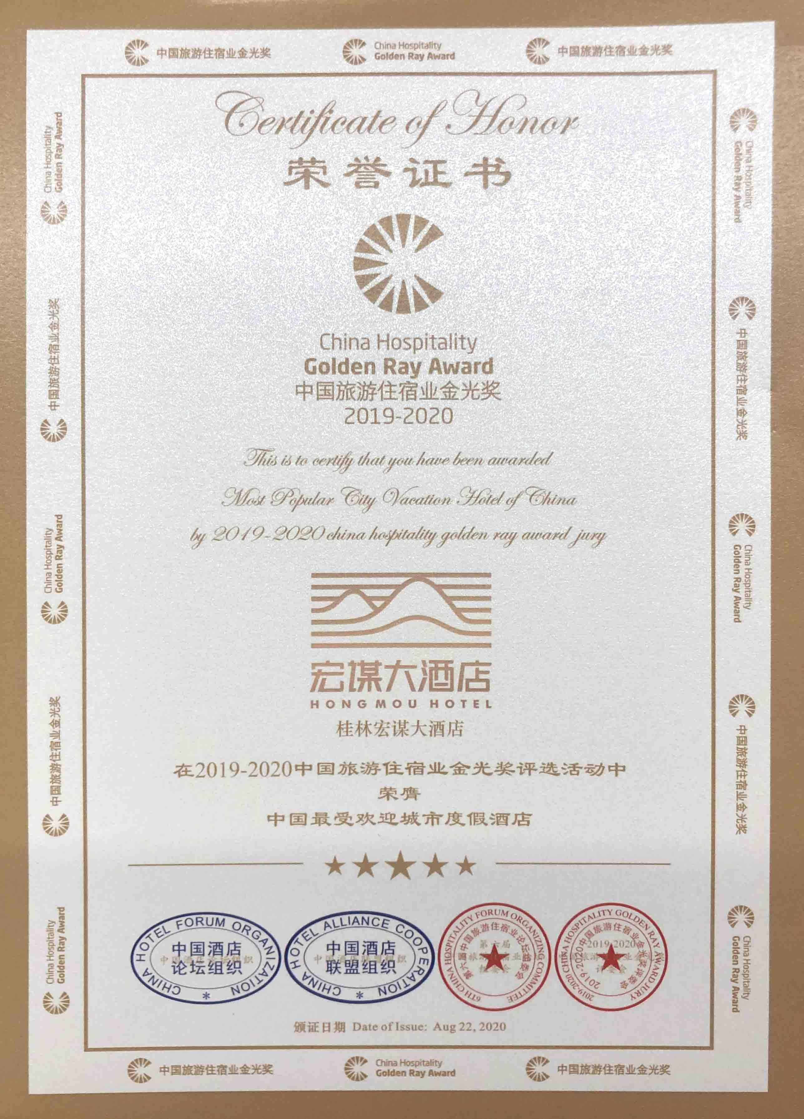 2020年8月21日,備受行業(yè)矚目的中國酒店業(yè)聯(lián)盟大會、中國旅游住宿業(yè)金光獎頒獎典禮在安徽六安隆重舉行。新城投資集團旗下桂林宏謀大酒店受邀出席此次盛會,并榮膺2019-2020中國旅游住宿業(yè)金光獎“中國最佳特色酒店”和“中國最受歡迎城市度假酒店”兩項殊榮。新城投資集團黨總支書記、董事長、總經理周道林代表集團公司及宏謀大酒店領獎。