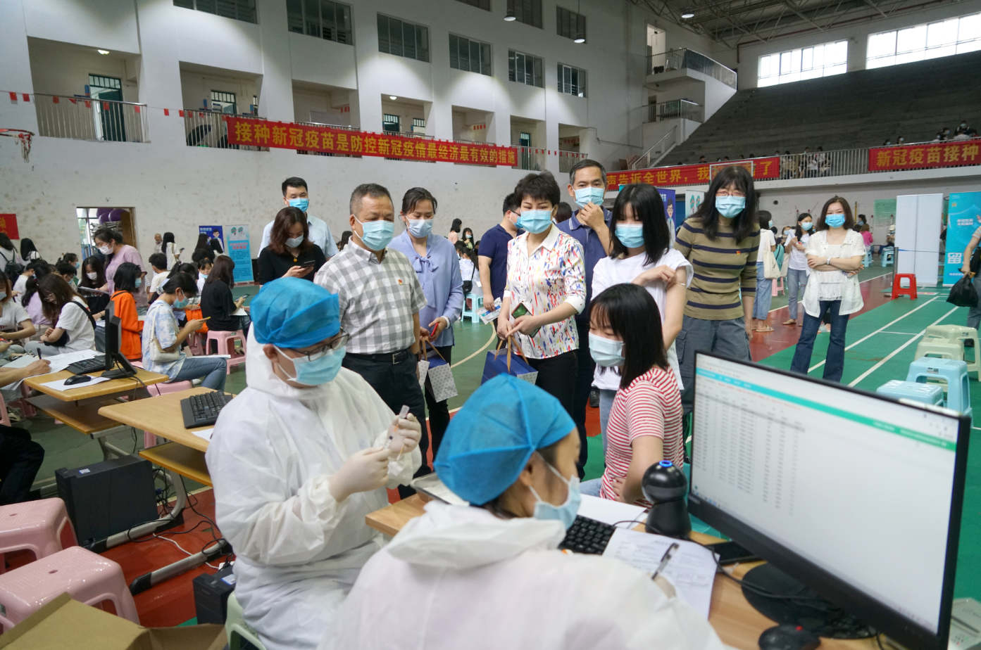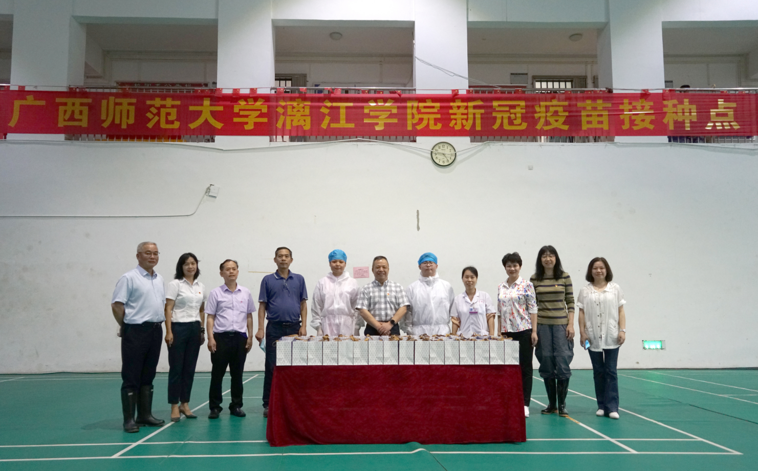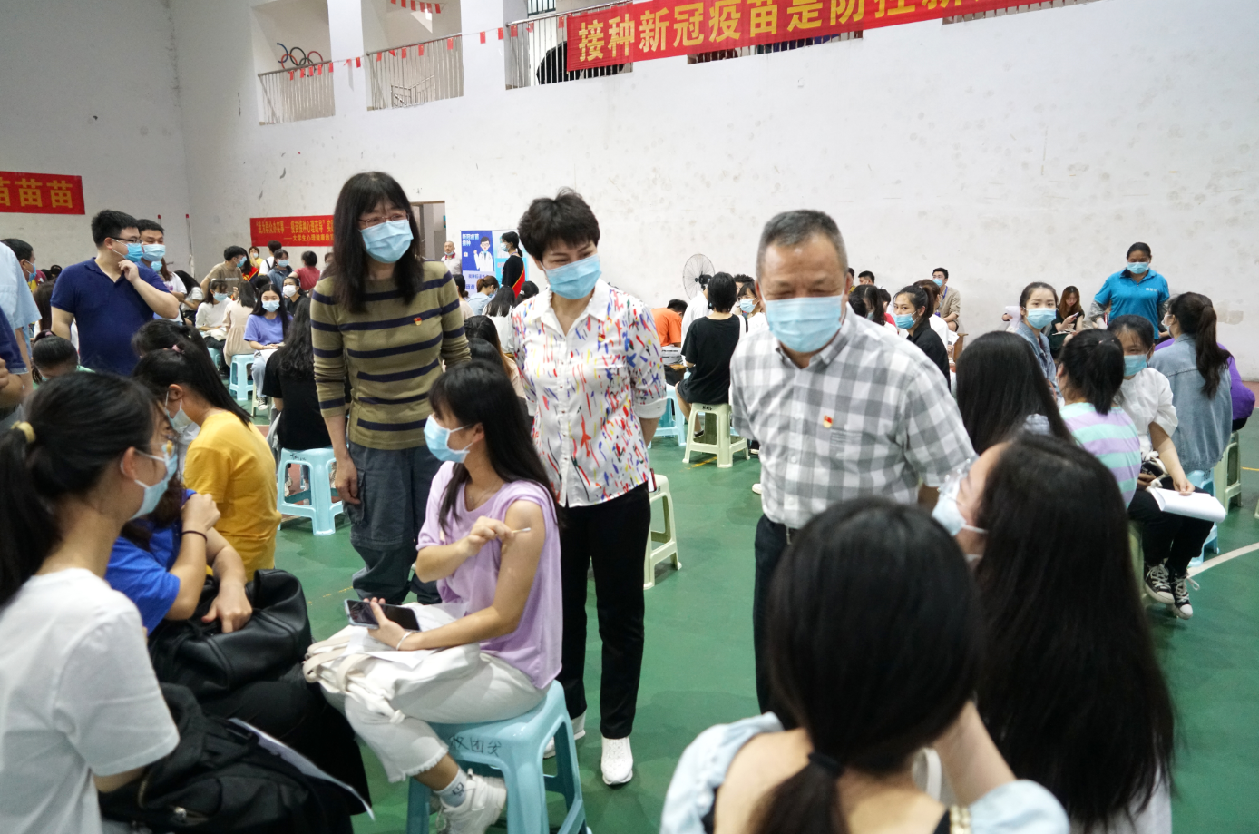 周道林一行在疫苗接種點(diǎn)查看接種情況、在留觀區(qū)詢問完成接種師生的觀察情況,并慰問了各服務(wù)點(diǎn)的醫(yī)護(hù)人員,代表新城投資集團(tuán)和漓江學(xué)院送上護(hù)士節(jié)的慰問品和祝福。