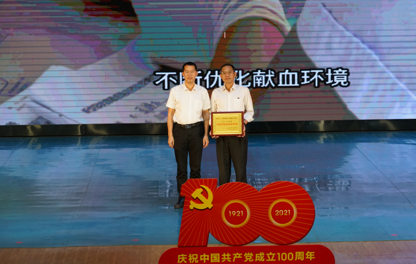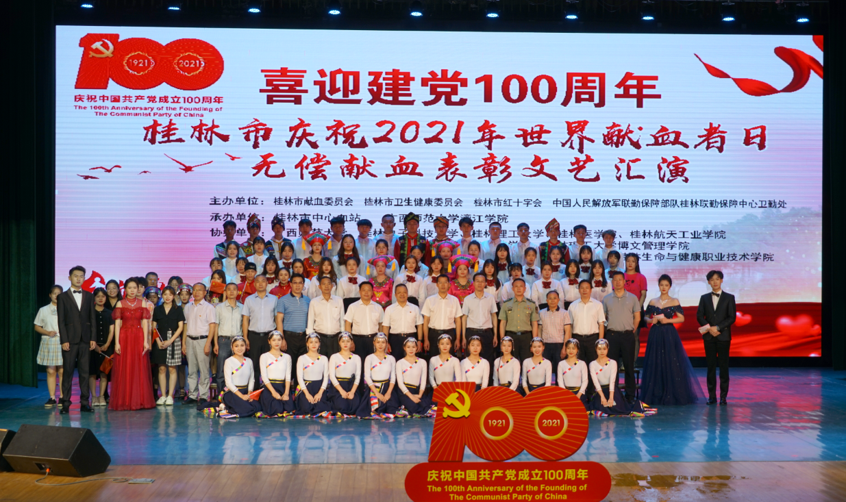 6月9日,由桂林市獻(xiàn)血委員會(huì)、桂林市衛(wèi)生健康委員會(huì)、桂林市紅十字會(huì)、中國(guó)人民解放軍聯(lián)勤保障部隊(duì)桂林聯(lián)勤保障中心衛(wèi)勤處主辦,桂林市中心血站、廣西師范大學(xué)漓江學(xué)院承辦的“喜迎建黨100周年桂林市慶祝2021年世界獻(xiàn)血者日無(wú)償獻(xiàn)血表彰文藝匯演”活動(dòng)在漓江學(xué)院召開。漓江學(xué)院獲得全場(chǎng)唯一“全國(guó)無(wú)償獻(xiàn)血促進(jìn)獎(jiǎng)單位獎(jiǎng)”。