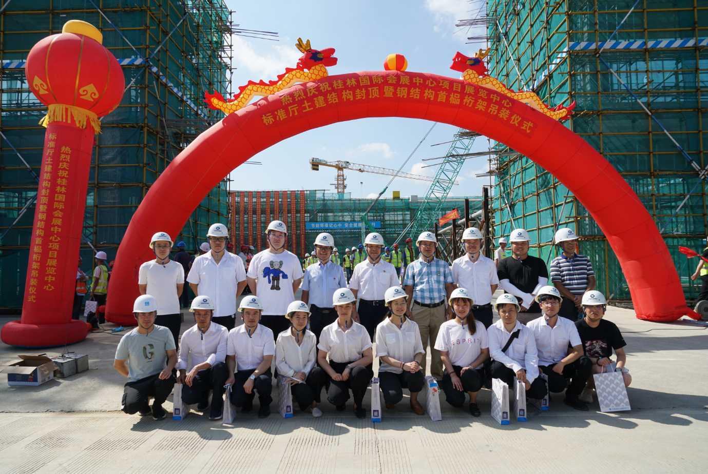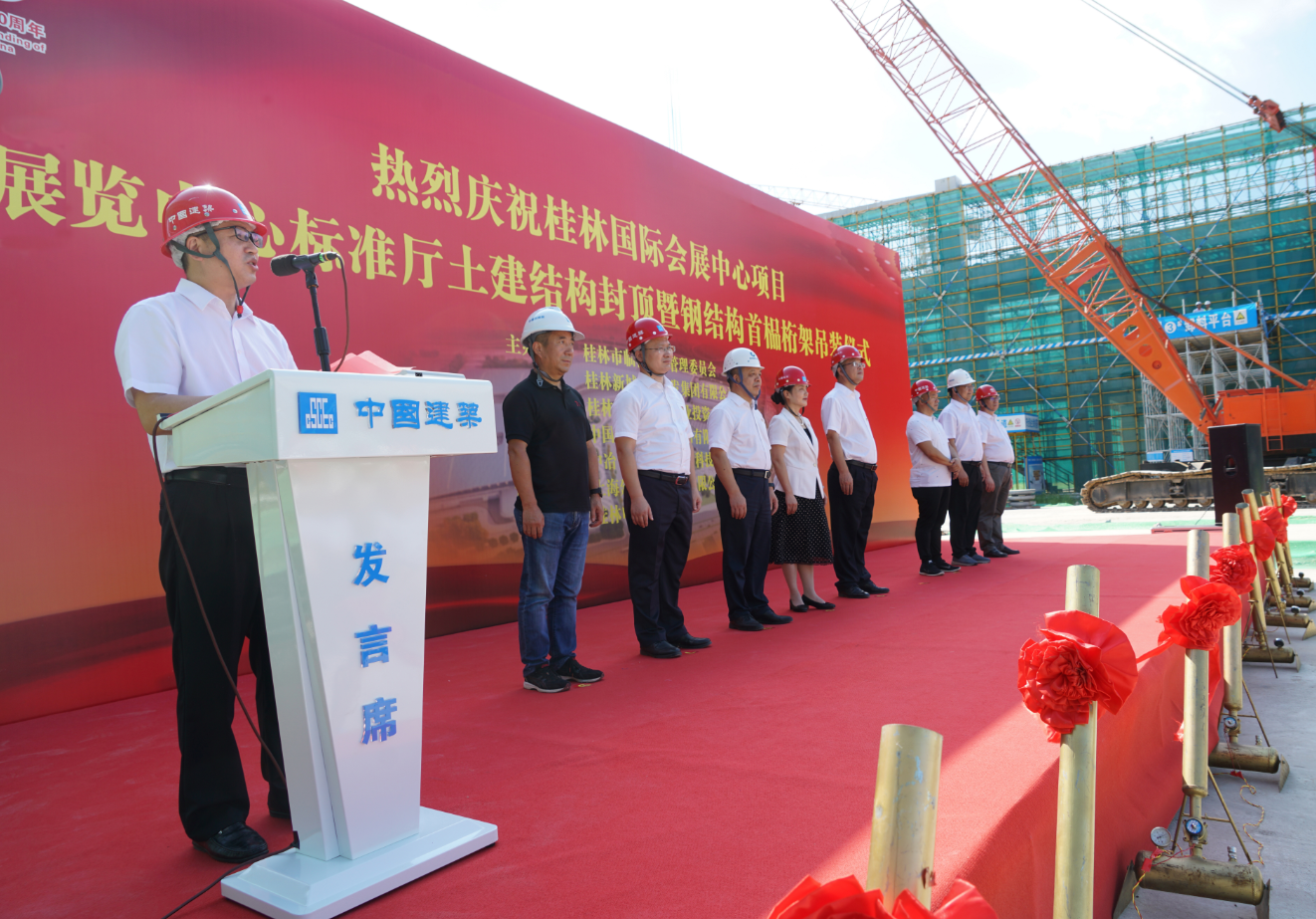 桂林國際會展中心項(xiàng)目展覽中心標(biāo)準(zhǔn)廳土建結(jié)構(gòu)封頂暨鋼結(jié)構(gòu)首榀桁架吊裝儀式圓滿舉行