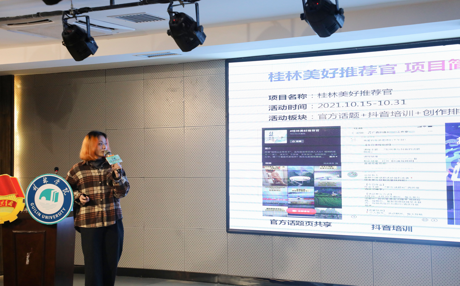 10月21日,“桂林美好推薦官--抖音推廣活動”在桂林學(xué)院至善講堂舉行?;顒游藦V大網(wǎng)友關(guān)注,當(dāng)日抖音話題播放達1.4億次。