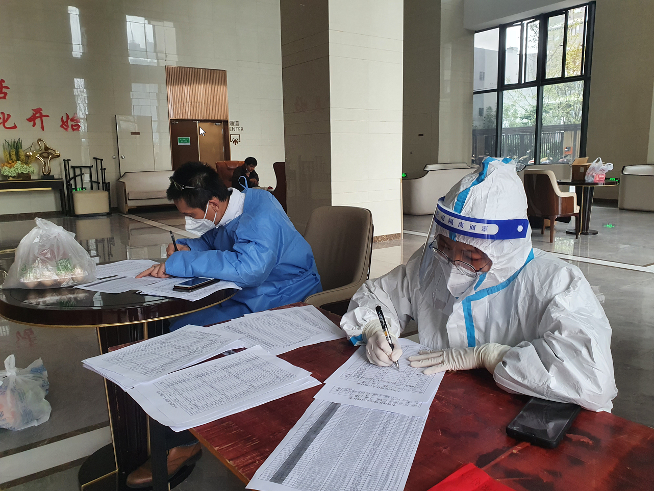通知一出,由新城投集團(tuán)包聯(lián)的5個小區(qū)的夜班志愿者、工作人員將近30人,都因所住小區(qū)提前封控?zé)o法到崗。集團(tuán)領(lǐng)導(dǎo)研究決定,集團(tuán)公司“疫情防控突擊隊”40名隊員,馬上帶好換洗衣服和充電寶趕到公司24小時待命,應(yīng)對當(dāng)晚夜班和次日6點(diǎn)早班人員無法到崗的突發(fā)情況。